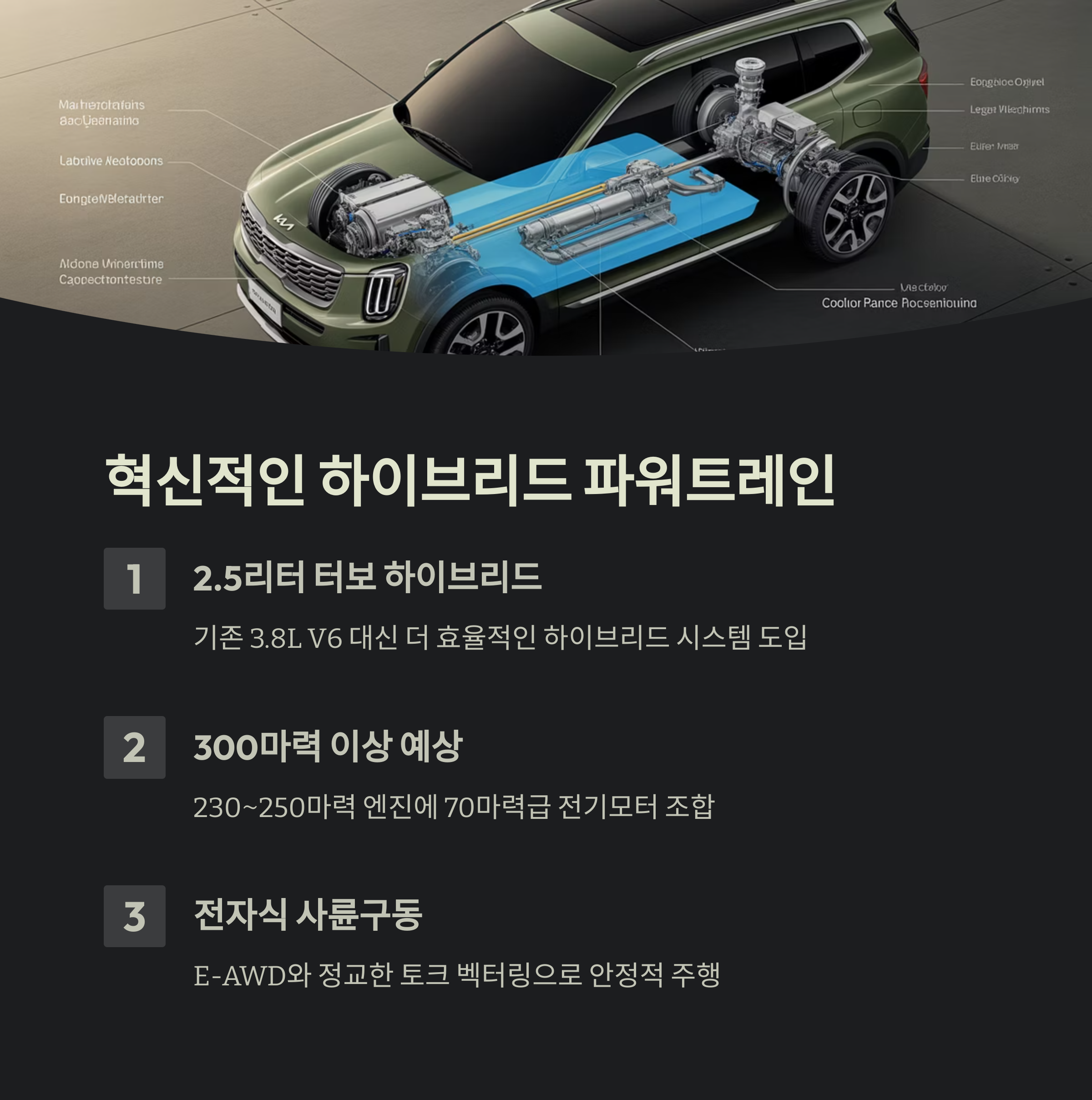 이번 기아 텔루라이드 풀체인지에서 가장 주목할 만한 변화는 단연 파워트레인 라인업의 재편입니다. 기존 모델의 3.8리터 자연흡기 V6 엔진 대신, 더욱 효율적이면서도 강력한 성능을 발휘하는 2.5리터 가솔린 터보 기반의 하이브리드 시스템이 새롭게 적용됩니다. 내연기관 엔진 자체로도 약 230~250마력 수준의 출력을 예상하며, 여기에 약 70마력급의 전기모터가 조화를 이룰 경우, 총 시스템 출력은 300마력을 가볍게 넘길 것으로 전망됩니다.